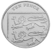The 10 pence (10p) coin is round and silver, with an image of Queen Elizabeth II on the front and a part of the Royal Shield on the back.