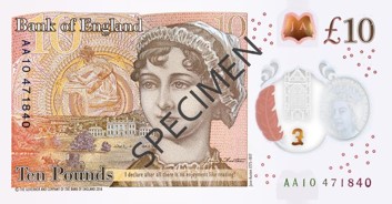 As of March 2018, a new yellow-orange £10 note has been introduced, featuring renowned author Jane Austen. On the front, there is a new hologram with the crown, a see-through portrait of Queen Elizabeth II, and Winchester Cathedral in gold foil. The reverse side has a profile of Jane Austen, a Pride and Prejudice quote, an illustration of Elizabeth Bennet, and an image of Godmersham Park. This new bill is also plastic and waterproof.