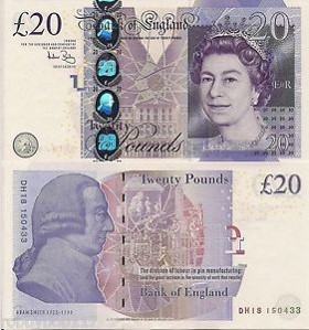 The Bank of England issued the Adam Smith £20 note in March 2007. The note features Adam Smith, an 18th-century Scottish philosopher, and economist, on the back. It is the same size and predominantly the same color (purple) as the old £20 note that featured English composer, Sir Edward Elgar.