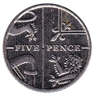 Five pence (5p) coins are similar to 10p coins. They are both round and silver, with Queen Elizabeth II on the front and a part of the Royal Shield on the reverse. However, the 5p coin is much smaller than the 50p, 20p, and 10p coins.